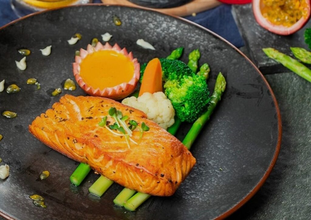 Frischer Lachs vom Grill mit hausgemachter Maracuja-Sauce , dazu frisches Gemüse der Saison. Serviert mit Jasmin Reis.